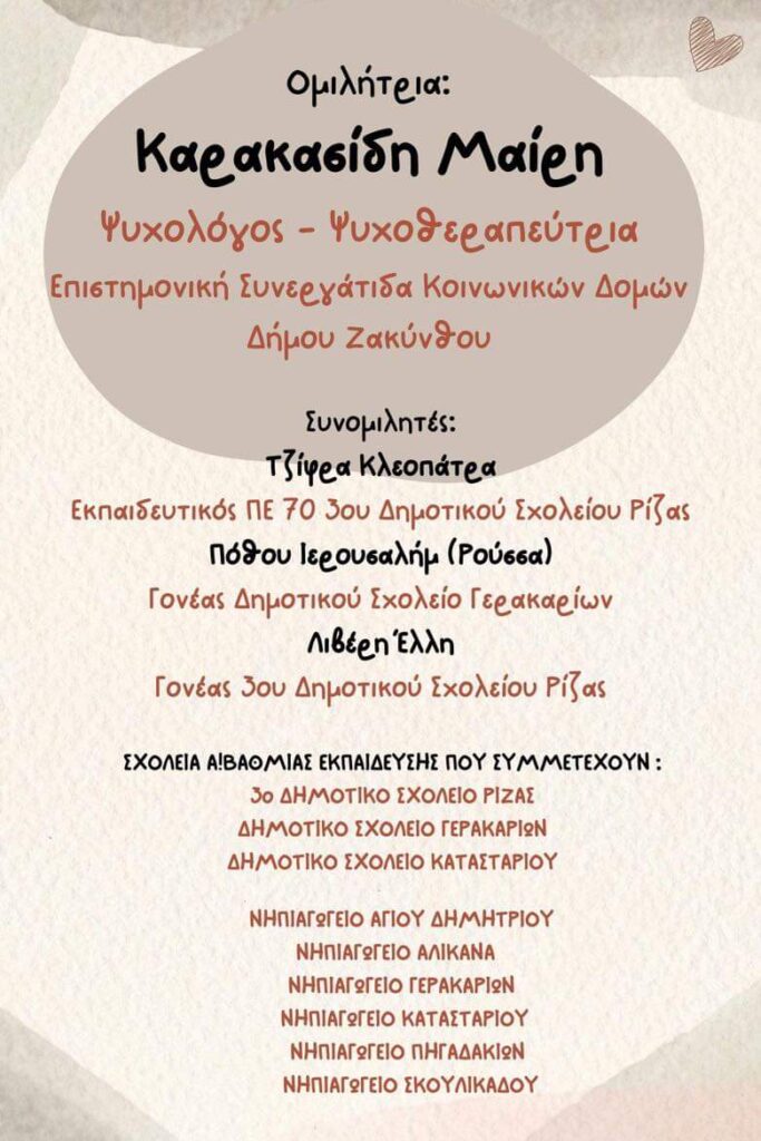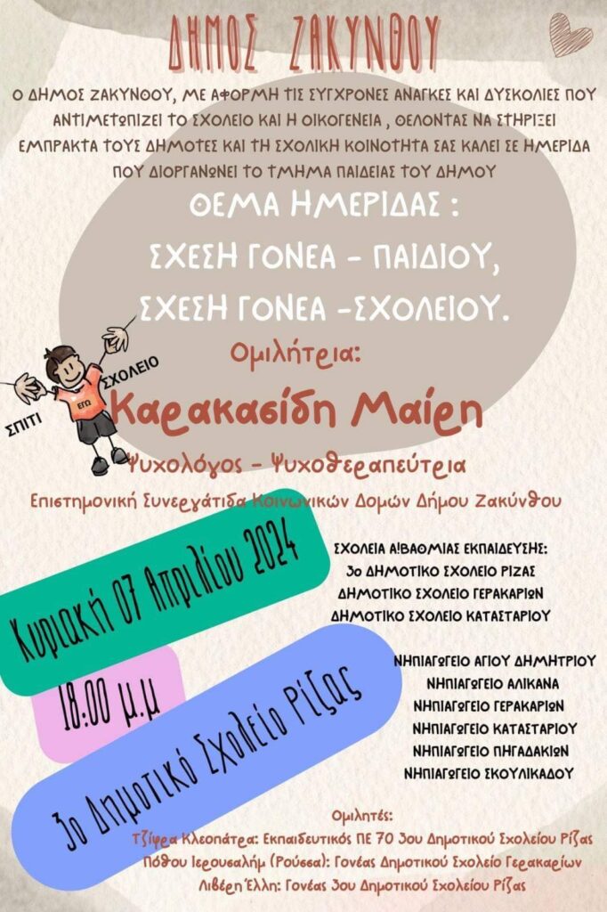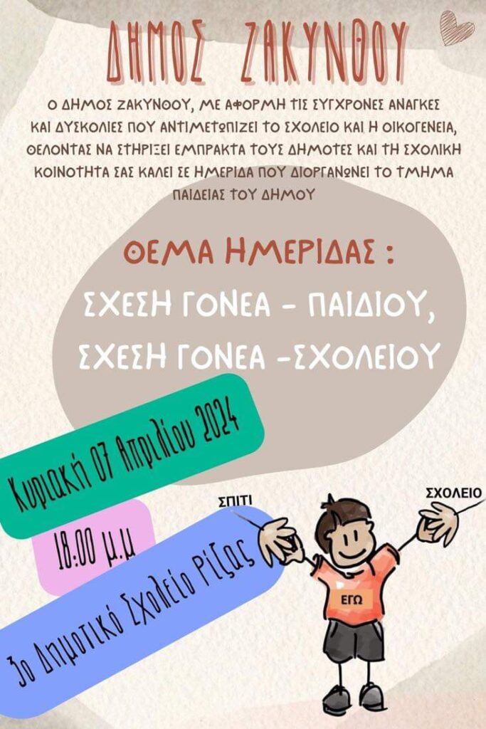 Την Κυριακή 7 Απριλίου 2024, στις 18:00 μ.μ., η αίθουσα του 3ου Δημοτικού Σχολείου Ρίζας θα φιλοξενήσει μία σημαντική εκδήλωση που αφορά στη σχέση γονέα-παιδιού και στον ρόλο των γονέων στο σχολείο. Η εκδήλωση αυτή αποτελεί μία πολύτιμη ευκαιρία για διάλογο, ανταλλαγή απόψεων και ενίσχυση της συνεργασίας μεταξύ των γονέων και του σχολείου. Σας περιμένουμε όλους να συμμετάσχετε και να συνεισφέρετε στη δημιουργική αυτή συζήτηση.